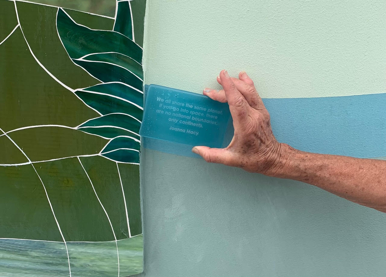 Contributors of $200 or more may choose to have a beautiful handcrafted fired sake bottle plaque inscribed on THE THIN BLUE LINE, symbolic of water and the biosphere we call home. The Thin Blue Line flows through the 321: mural over the columns.